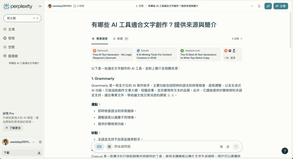 - 尋找可信來源時,可詢問「有哪些 AI 工具適合文字創作?提供來源與簡介」