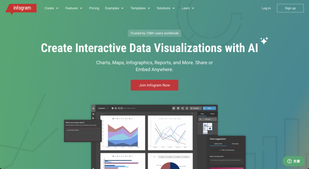 簡介:Piktochart 的 AI 圖表生成器能快速將數據轉化為專業的圖表和資訊圖形,適合非設計專業人士使用。
