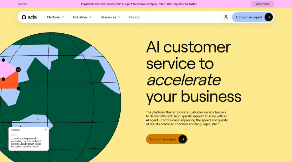 Ada 是一款以客服與聊天支持為核心的 AI Agent 平台,專門設計來自動處理用戶查詢並協助客服團隊提供高效、個性化的支援。