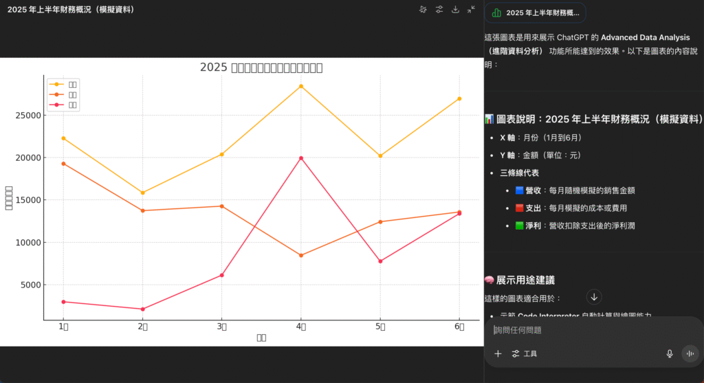 - 自動圖表生成:問「請畫出各月份營收變化圖」