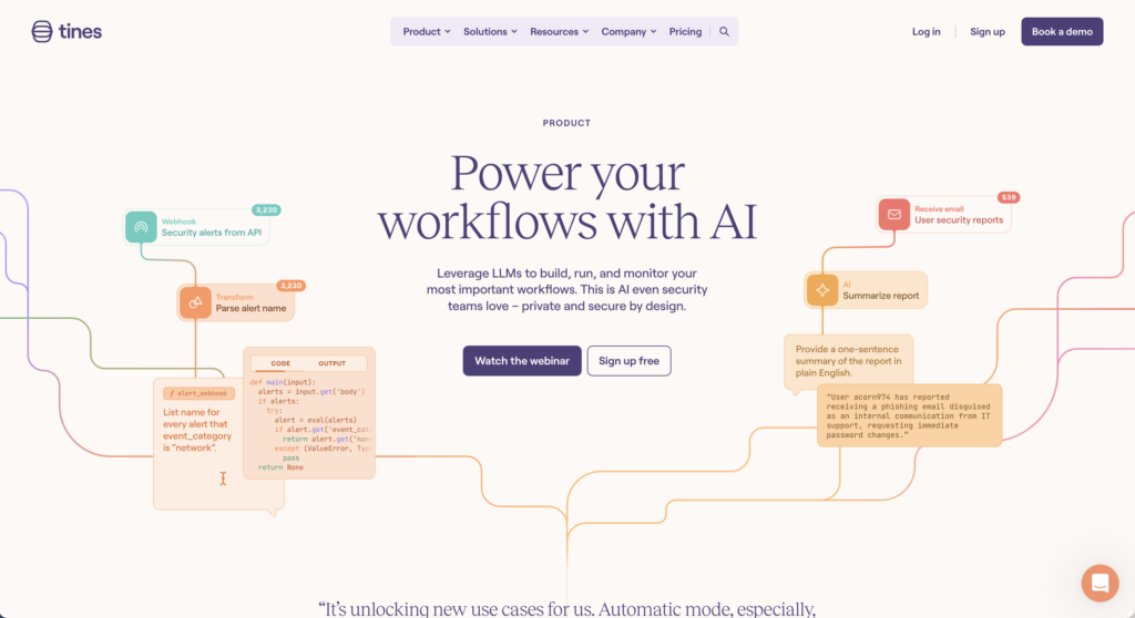 Tines 是資安、IT、法遵領域熱門的自動化平台,2025 年加入 AI 模組後,可執行主動事件回應(SOAR)、風險評估建議、內部流程合規監控。