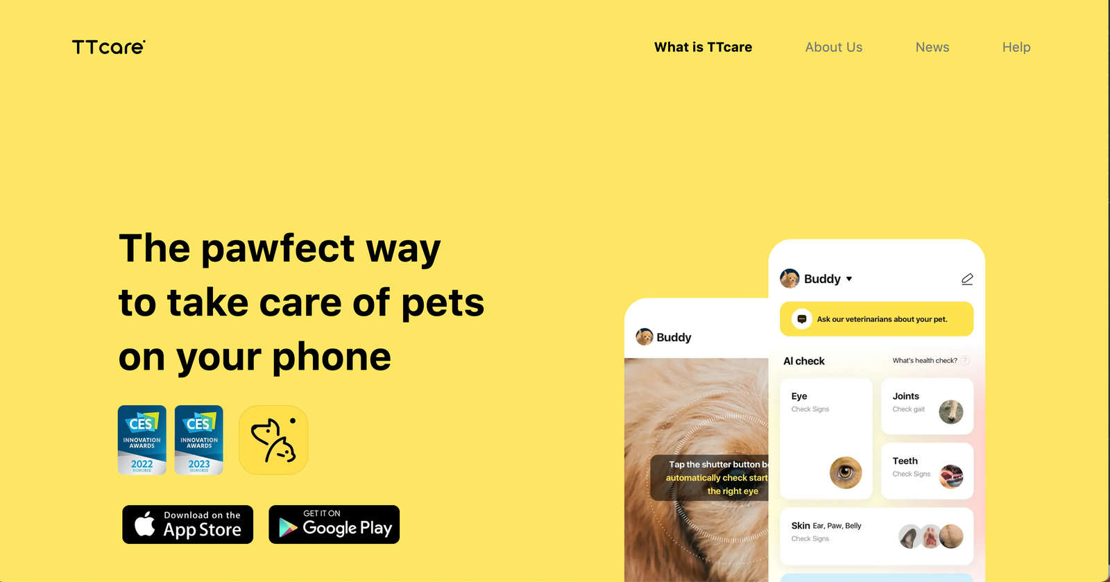 TTcare 是由南韓公司 AI FOR PET 開發的 AI 寵物健康管理應用程式。該應用程式允許飼主透過手機拍攝寵物的眼睛、皮膚、牙齒或關節等部位的照片,AI 系統會自動分析這些影像,並提供初步的健康診斷。