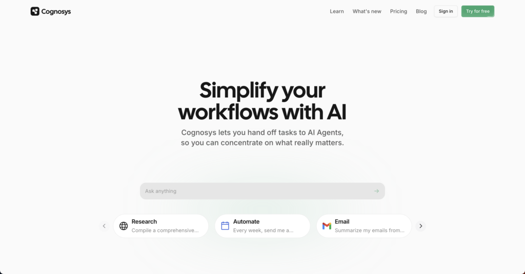 Cognosys 是一套工作導向的 AI Agent 系統,可自動撰寫報告、分析資料並與應用程式整合。