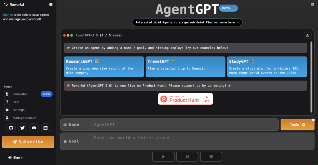 AgentGPT 是一款瀏覽器介面友善的 AI Agent 工具,只需輸入任務(例如:「幫我整理 5 個行銷活動提案」),它就會自動拆解目標、思考策略、執行步驟。