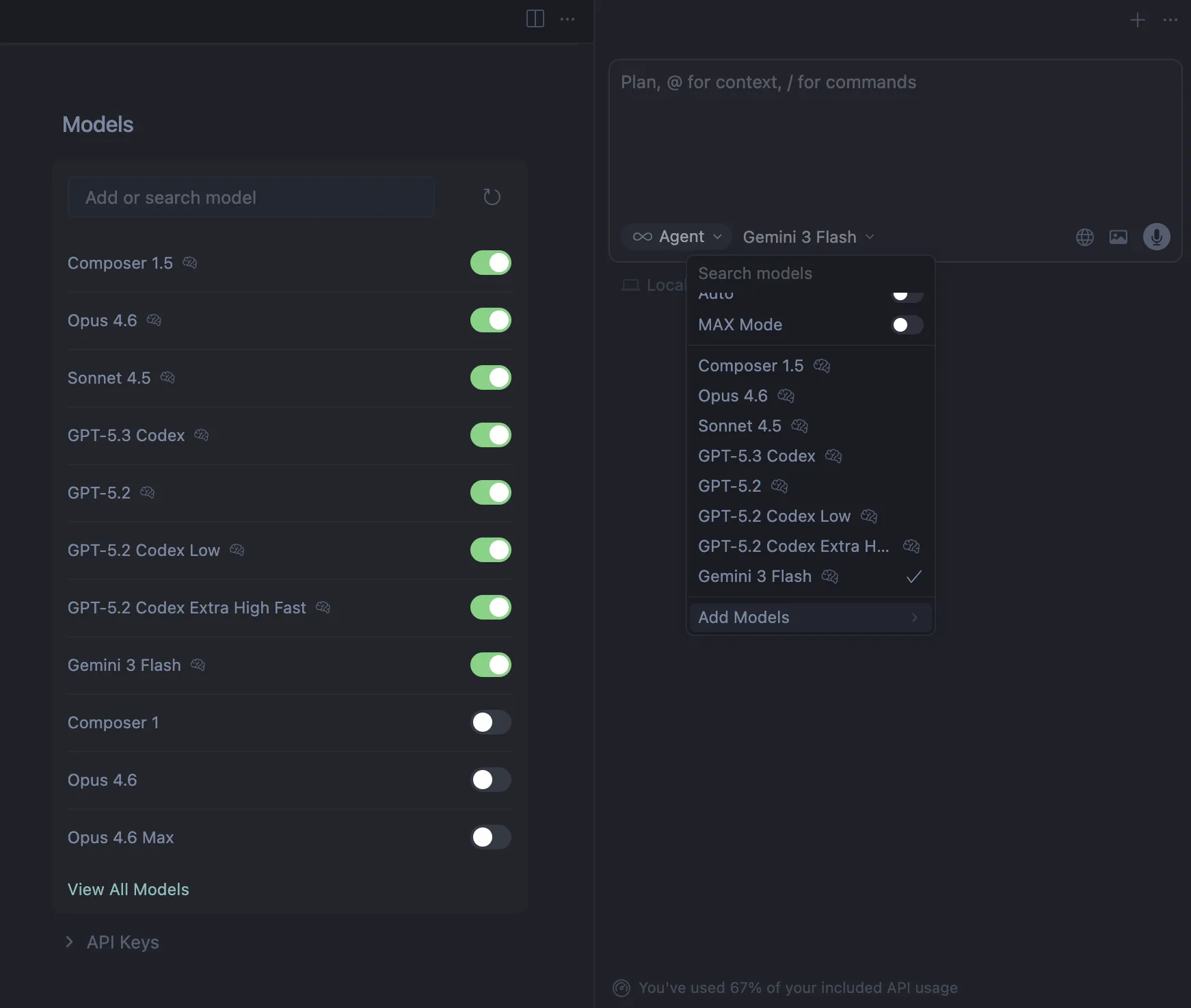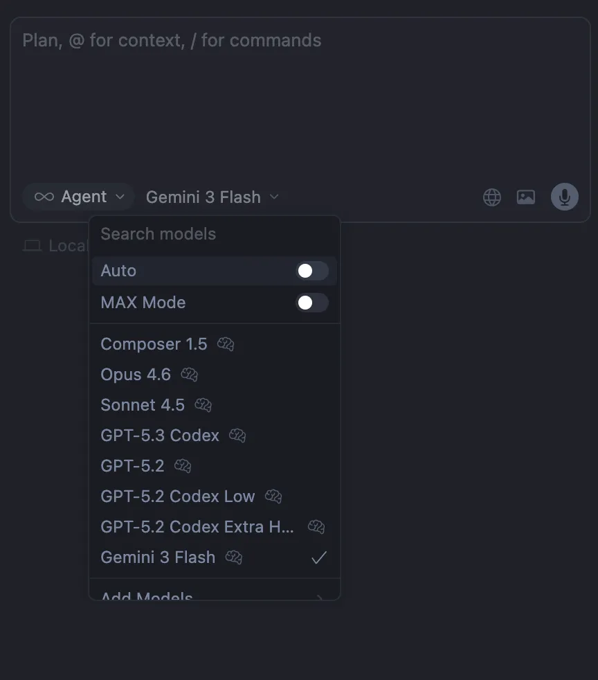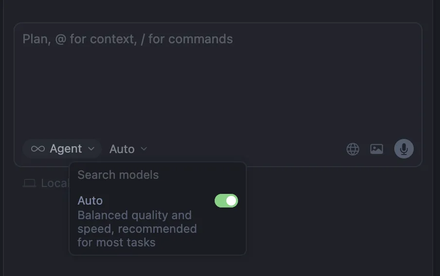 一開始安裝 Cursor,通常會預設是 Auto(它會根據你的任務自動挑模型)。如果你想要很有效率,或很無腦,或你口袋很深,先用 Auto 也可以。