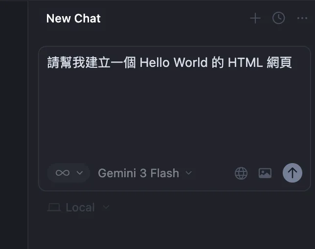 請 AI 幫我建立一個 Hello World 的 HTML 網頁。到 新的對話框中,選好模型後,輸入『請幫我建立一個 Hello World 的 HTML 網頁』