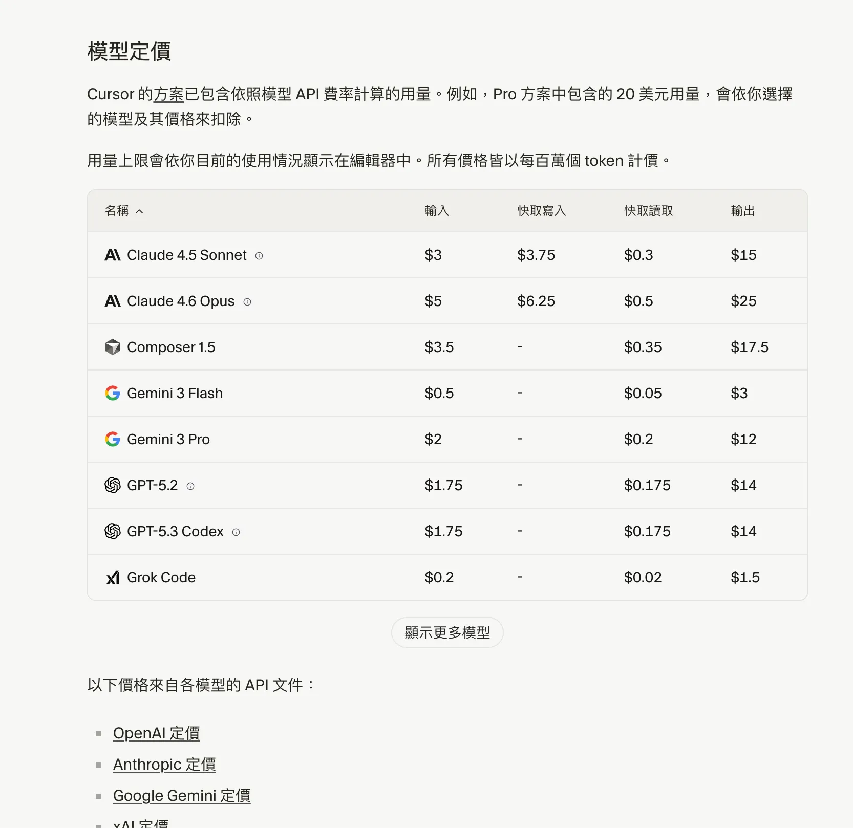 每個不同模型的計價表如下,其實他光是用看報價表是有點難感受使用量的(我自己覺得這是 AI 收費最可怕的黑洞)。所以用我自己實際使用的體驗來讓大家知道,如果我用 Auto 大概用了三天(每天約使用3-4小時),依照 Cursor 所給的計費表,使用了大概 $8 美金,其實是有嚇到我的。