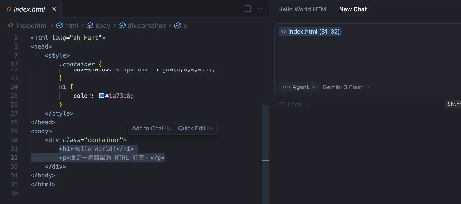 你如果想針對某幾行程式碼做調整(例如:字變大、變紅),你要先把「你想改的那段程式碼」丟進聊天視窗,讓它知道上下文。