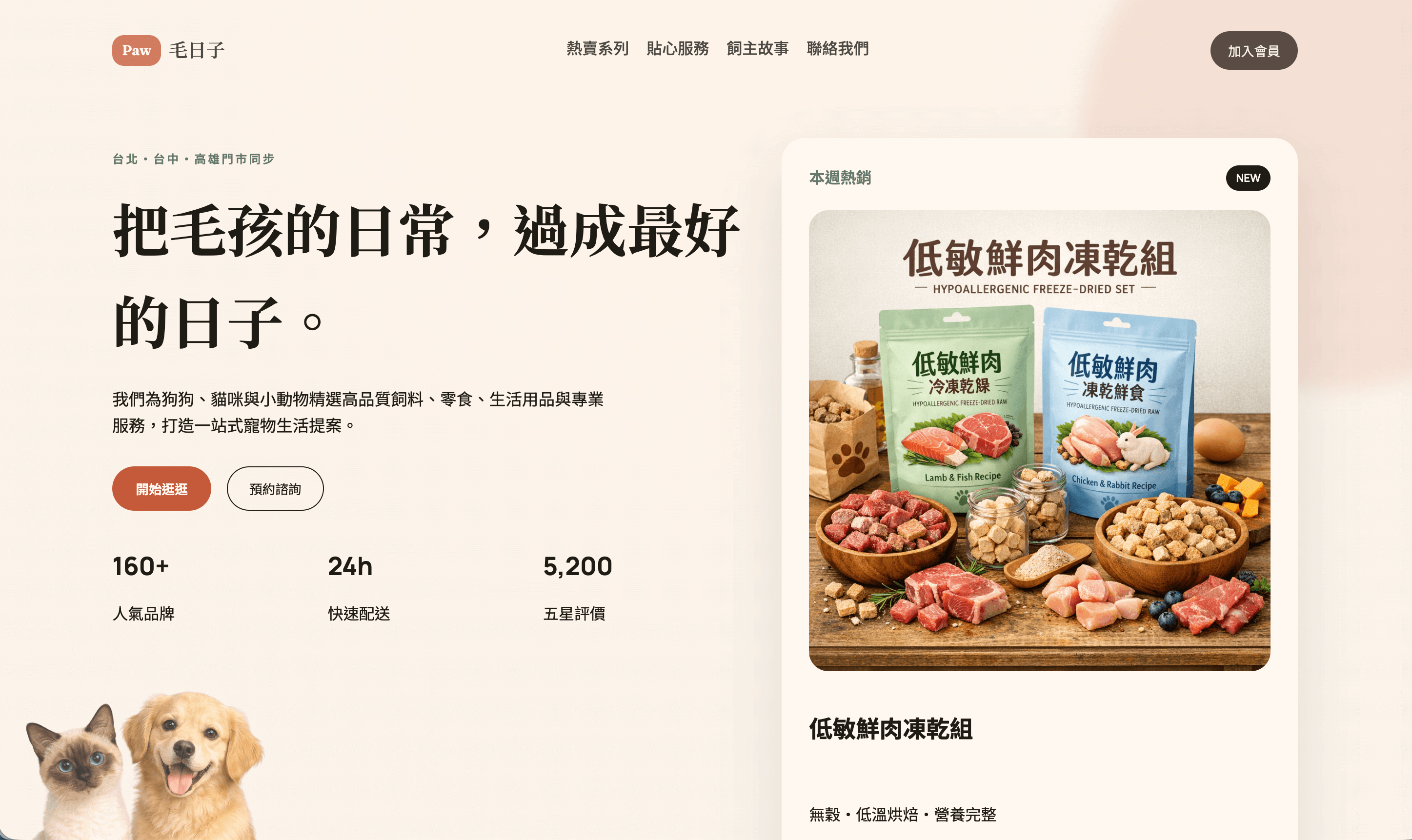 精緻的寵物電商 Landing Page,包含熱銷商品、貼心服務與飼主故事區塊。